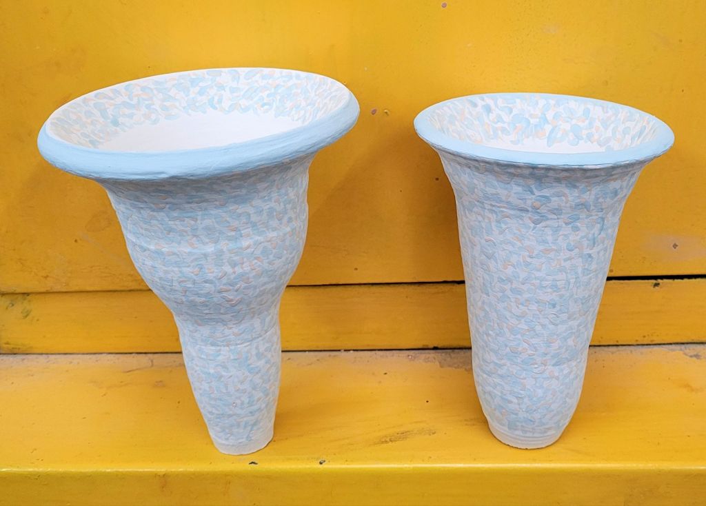 Thanks to Karen, Charlotte, Jenny, Lee and Sarah for their company and friendly conversation. Such a lovely atmosphere.  I finished off some pots that I’ve been working on for a few months, spraying on a glaze layer before the final – stoneware – firing. I have some different decorating techniques that I’ve been experimenting with, so looking forward to seeing how they turn out.