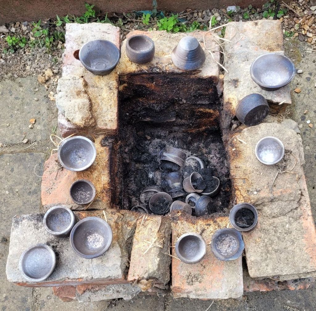 The sawdust firing went well. All the pots now carry various shades of smoky grey. They are not fully vitrified but significantly less porous than when they were in the ‘bisque’ or ‘biscuit’ state. I’m not sure what temperature the sawdust kiln reaches and will have to do some tests in future firings to find out.